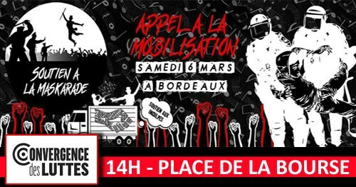 Samedi 6 mars 2021, les divers comités de soutien à La Maskarade ont lancé un appel à manifestation, appel que nous relayons et pour lequel nous vous appelons à nous rejoindre à Bordeaux.