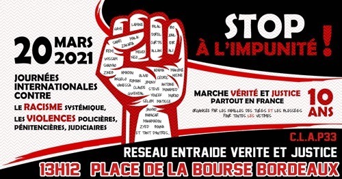 Samedi 20 mars 2021, Le Réseau d'Entraide Vérité et Justice a lancé un appel à manifestation, appel que nous relayons et pour lequel nous vous appelons à nous rejoindre à Bordeaux.