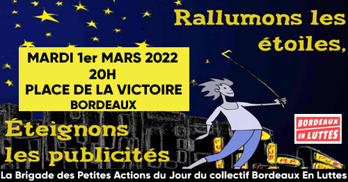 💥 La Brigade des Petites Actions du Jour du collectif Bordeaux En Luttes vous propose une petite balade nocturne dans Bordeaux mardi 1 mars 2022 à 20h00, départ Place de la Victoire, pour éteindre les néons des magasins restés allumés.