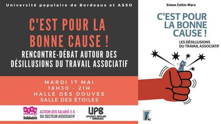 L'Université Populaire de Bordeaux et le syndicat ASSO-Solidaires (Action des salarié.e.s du secteur associatif) vous invitent à une soirée rencontre-débat, le mardi 17 mai à 18h30, en présence du sociologue Simon Cottin-Marx, auteur de C'est pour la bonne cause - Les désillusions du travail associatif (Éditions de l'atelier).