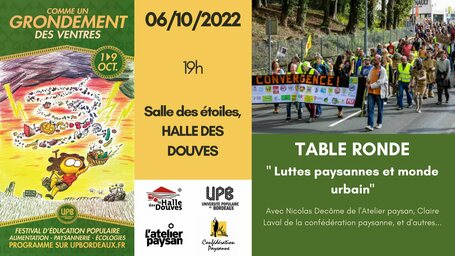 Le jeudi 6 octobre, on vous propose une table ronde sur la question des luttes paysannes, depuis une ville, en tant qu'association citadine.
