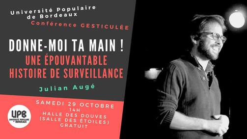 L'Université Populaire de Bordeaux vous invite à venir voir, le samedi 29 octobre à 14h, à la Halle des douves (salle des étoiles), la conférence gesticulée de Julian Augé : Donne-moi ta main ! Une épouvantable histoire de surveillance