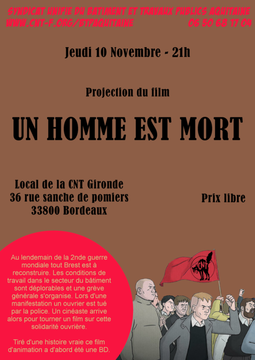Jeudi 10 novembre (veille de jour férié), nous organisons au local de la CNT-F la projection du film d'animation "Un homme est mort" suivi d'une discussion/débat et boire un coup autour du bar.