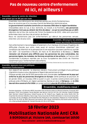 Il s'agira d'une déambulation-sensibilisation dans les rues de Bordeaux, le rendez-vous est donné à 14h place de la Victoire et sera suivi d'un rassemblement devant le commissariat central de Mériadeck pour demander la fermeture des Centres de rétention (CRA) et contre la construction d'un nouveau grand CRA à Mérignac.