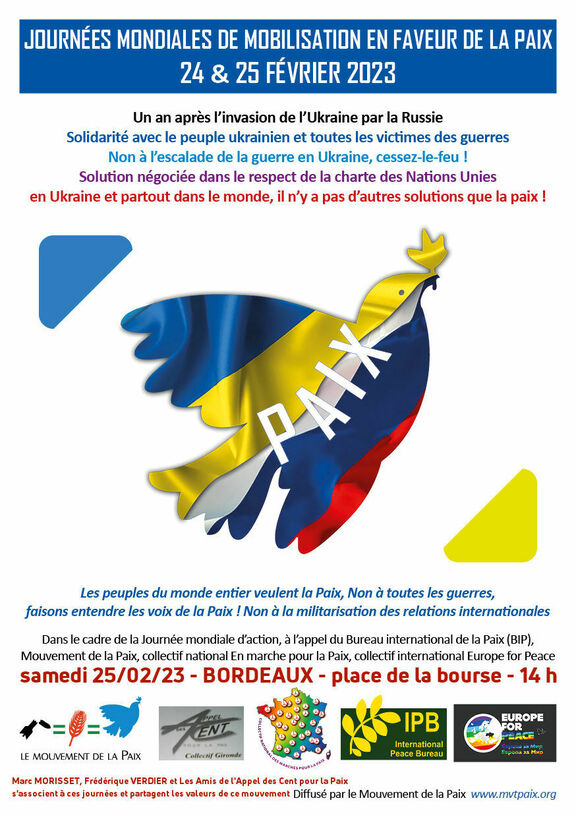 la ville de Bordeaux sera la 3ème ville de Gironde à répondre à l'appel des journées internationales de mobilisation en faveur de la paix comme cela devrait apparaître prochainement sur le site du Mouvement pour la Paix (voir le lien ci-après).
