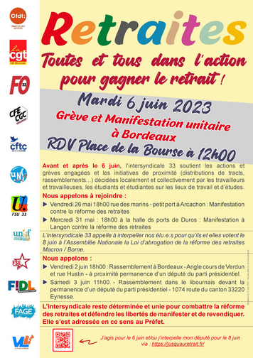 Le Mardi 6 Juin à 12h Place de la Bourse à Bordeaux, l'ensemble des organisations syndicales nous appellent à nous rassembler à nouveau et à participer à une nouvelle journée de mobilisation, et de manifestation pour défendre entre autre nos droits à une retraite décente. La mobilisation ne faiblit pas !