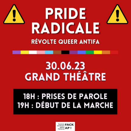 Comme chaque année, la Pride Radicale n'est pas une manifestation déclarée. Manifester est un droit fondamental. Il n'est pas illégal, ni de ne pas déclarer une manif, ni d'y participer et ne constitue pas une effraction à ce titre pour les manifestant·es.
