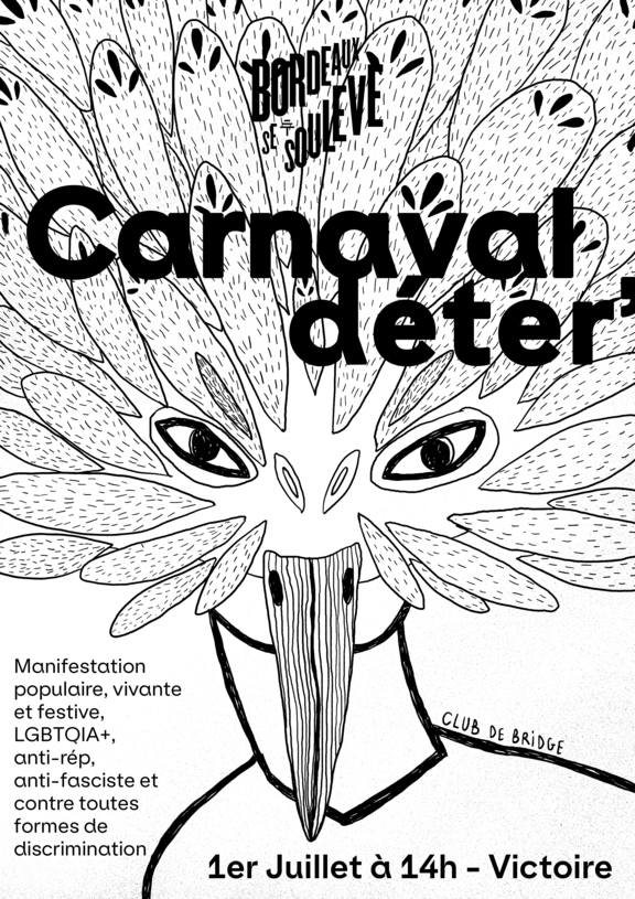 Contre les politiques du gouvernement et son monde, rassemblons-nous pour un carnaval populaire, festif et déterminé ce 1er juillet Place de la Victoire. Manifestons ensemble dans la joie et la bonne humeur à la hauteur de notre rage ! Déguisons-nous, parons-nous de couleurs, de peinture et de paillettes ; grimons-nous de nos plus beaux maquillages et nos masques les plus créatifs !