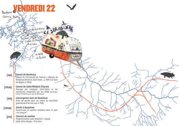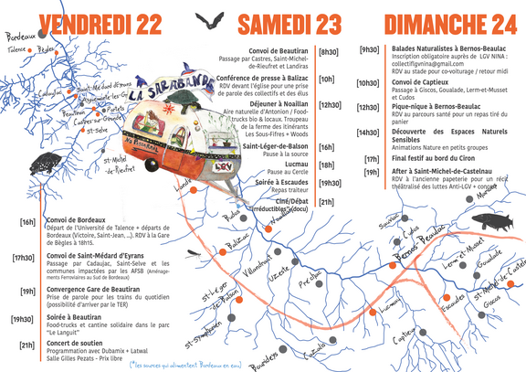 Et pour commencer, les 22/23/24 septembre depuis Bordeaux jusqu'au cœur de Vallée du Ciron, avec le nœud ferroviaire de Bernos-Beaulac, c'est le magnifique territoire sud-girondin, riche de ses zones humides, rivières et sources que nous défendrons contre des tonnes de bétons. Vous aussi, rejoignez-nous ! Les collectifs vous invitent à rejoindre largement les différents convois organisés, qui convergeront une première fois le vendredi 22 septembre au soir, à Beautiran, puis à d'autres moment dans le weekend (voir programme).