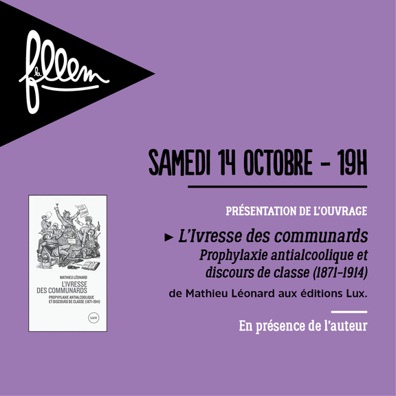Dans le cadre de la FLLEM (Fête du Livre libertaire et de l'Édition militante) qui se tiendra à l'Athénée libertaire les 14 et 15 octobre, la Librairie du Muguet présente le livre L'ivresse des communards. Prophylaxie antialcoolique et discours de classe (1871-1914) de Mathieu Léonard aux éditions Lux en présence de l'auteur.