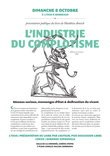 Dimanche 8 octobre à 17h30 Présentation publique du livre de Matthieu Amiech L'industrie du complotisme (Éditions La lenteur 2023).