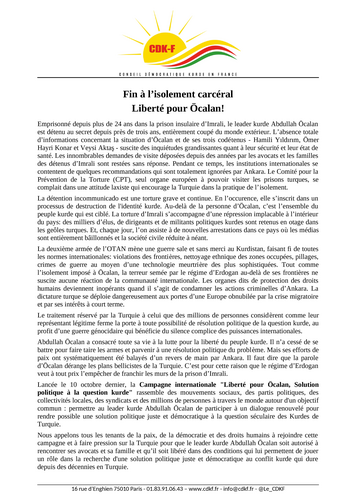 Nous appelons tous les tenants de la paix, de la démocratie et des droits humains à rejoindre cette campagne et à faire pression sur la Turquie pour que le leader kurde Abdullah Öcalan soit autorisé à rencontrer ses avocats et sa famille et qu'il soit libéré dans des conditions qui lui permettent de jouer un rôle dans la recherche d'une solution politique juste et démocratique au conflit kurde qui dure depuis des décennies en Turquie.