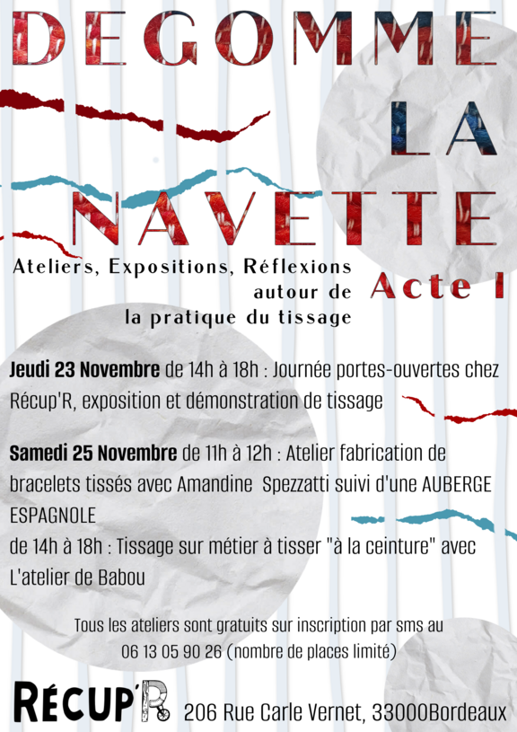 De 14h à 18h, dans le cadre de la Semaine Européenne de la Réduction des Déchets, l'association Récup'R ouvre ses portes. Au programme, visite des ateliers, démonstration de tissage sur métier à tisser et exposition de l'artiste tisserande Amandine Spezatti.