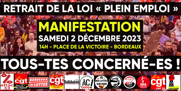 Manifestation samedi 2 décembre 2023 à 15h Place de la Victoire à Bordeaux