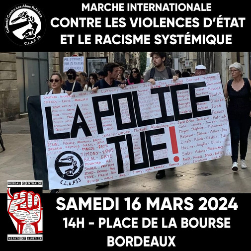 Tout le long du mois de mars, le collectif Contre Les Abus Policiers (C.L.A.P33) organise, pour marquer ses 15 ans d'existence, des évènements autour des violences d'État et du racisme systémique (tables rondes, projections, conférences, ateliers, concerts....) dont la marche annuelle le 16 mars : https://gironde.demosphere.net/rv/14174