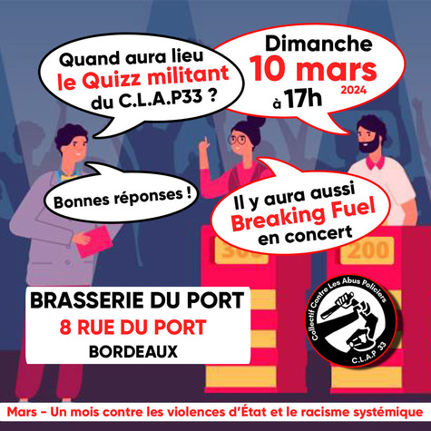 Tout le long du mois de mars, le collectif Contre Les Abus Policiers (C.L.A.P33) organise, pour marquer ses 15 ans d'existence, des évènements autour des violences d'État et du racisme systémique (tables rondes, projections, conférences, ateliers, concerts....) dont la marche annuelle le 16 mars : https://gironde.demosphere.net/rv/14174