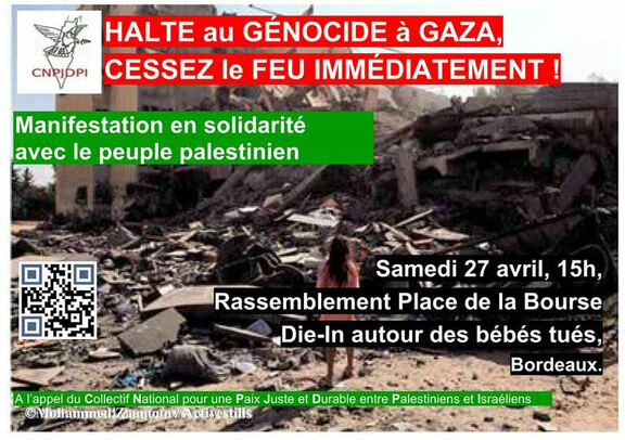 Le carnage génocidaire se poursuit à Gaza avec les bombes américaines des criminels de l'Etat israélien. En vue de contribuer à faire pression pour que soit imposé un cessez le feu immédiat et permanent à Gaza et que cessent les exactions meurtrières des colons à l'encontre des palestiniens en Cisjordanie, le Collectif Girondin pour une Paix Juste et Durable entre Palestiniens et Israéliens organise un rassemblement.