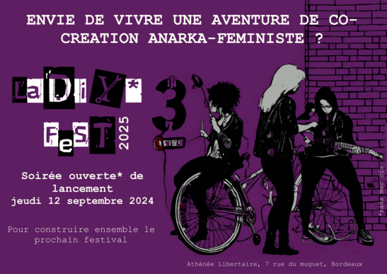 L'Athénée a déjà accueilli deux éditions de LaDIY*Fest, en 2022 et 2023. A l'initiative de la Grrrogne Anarka-Féministe (GrrrAF), le festival a permis de rassembler des camarades qui se retrouvaient dans les principes de l'anarka-féministe : construire un moment en non-mixité choisie, sans mecs cisgenres, qui mêle rencontres, discussions, formations, concerts, dans un esprit anarchiste et punk-féministe. L'objectif : se donner de la force, du lien, de la confiance, du soutien, des idées et de la rage pour continuer la lutte.