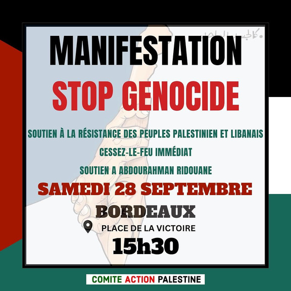 Rendez-vous samedi 28 septembre place de la Victoire. Nous vous attendons nombreux pour exiger un cessez-le-feu immédiat et porter également tout votre soutien à notre camarade Abdourahman Ridouane, soumis à un arrêté d'expulsion par le ministère de l'Intérieur et le conseil d'Etat, notamment pour son soutien à la Palestine. Pas de justice, pas de paix !