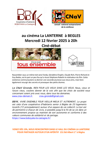 Nous avons le plaisir de vous convier au ciné débat que le CNaV Gironde (Conseil National autoproclamé de la Vieillesse) et les BOBOYAKA (projet d'habitat coopératif) organisent le 12 février 2025 au cinéma La Lanterne à Bègles.