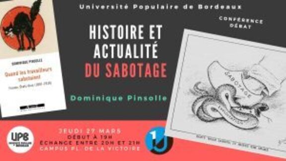 L'UPB vous invite, le jeudi 27 mars, à écouter Dominique Pinsolle et échanger avec lui autour du sabotage... On commence à 19h avec un exposé, et on garde un bon moment pour échanger dans la salle, jusqu'à 21h.