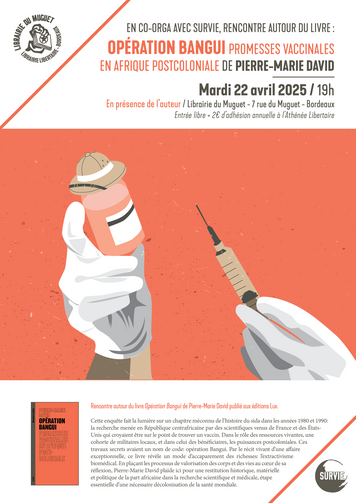 Survie 33 co-organise avec la Librairie du Muguet une rencontre avec Pierre-Marie David auteur de l'ouvrage paru le 11 avril 2025 dans la collection des Dossiers Noirs publiée aux Éditions Lux : Opération Bangui - Promesses vaccinales en Afrique Postcoloniale.