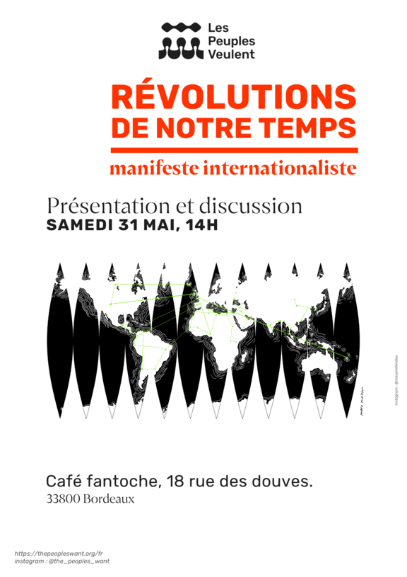 Le collectif internationaliste des peuples veulent présentent leurs analyses avec l'ouvrage « Manifeste internationaliste : une révolution de notre temps ». Venez à leur rencontre pour en discuter le samedi 31 mai à 14h au café fantoche.