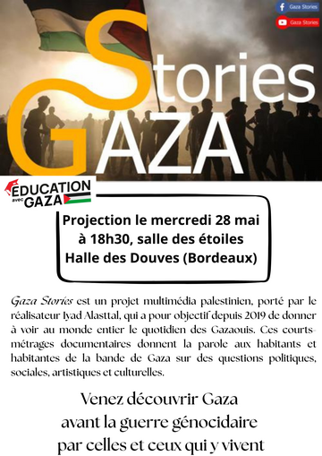 Projection débat de plusieurs courts-métrages "Gaza Stories" mercredi 28 mai 18h 30 à la Halle des Douves (Bordeaux) salle des étoiles