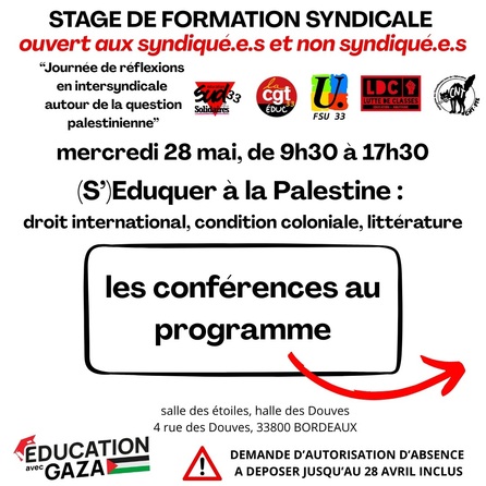 PROGRAMME COMPLET du Stage de formation intersyndicale "(S')Éduquer à la Palestine" Mercredi 28 mai à Bordeaux (demande à envoyer JUSQU'AU 28 AVRIL à votre chef de service par mail) ouvert aux non syndiqué es