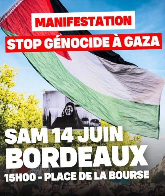 Manifestation intersyndicale à Bordeaux samedi 14 juin avec départ à 15 heures Place de la Bourse aux cotés du collectif 33 « Pour une paix juste et durable entre Israëlien.es et Palestinien.nes ».