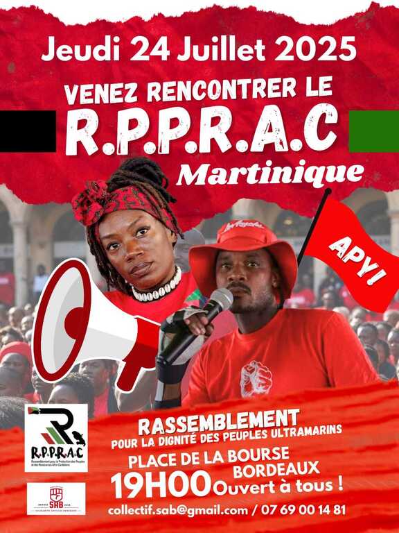 Après des mois de lutte acharnée pour dénoncer l'abbération des prix des denrées alimentaires en Martinique et dans les outre-mer de manière générale, les membres fondateurs du RPPRAC Martinique seront présents à Bordeaux jeudi 24 juillet dès 19h00 Place de la Bourse pour échanger avec la communauté antillaise de Bordeaux et informer les autres communautés des injustices sociales et économiques subies par les Antilles, la Guyane, la Réunion, Mayotte, la Nouvelle-Calédonie etc..