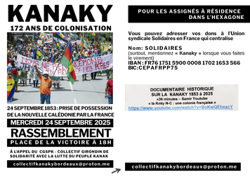 172 ans de colonisation ! C'est pour commémorer cette date du 24 septembre 1853 que les amiEs de la Kanaky, et les Kanak eux-mêmes, se retrouveront au Rassemblement prévu Place de la Victoire.