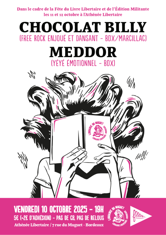20h : Concert de soutien à la librairie du Muguet avec Chocolat Billy (free rock enjoué et dansant - Bdx/Marcillac) et Meddor (yéyé émotionnel - Bdx) - 5e + 2e d'adhésion à l'Athénée libertaire.