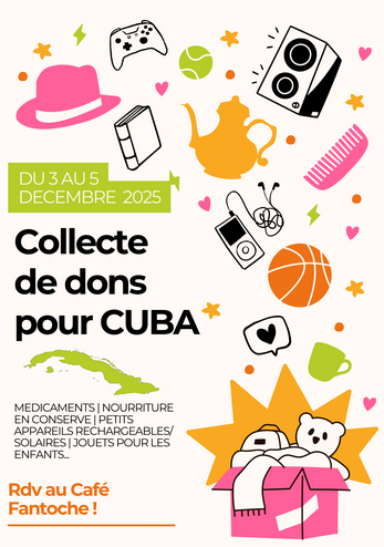 Du 3 au 5 décembre, au Café Fantoche : Après le passage de l'ouragan Melissa, la situation est critique à Cuba. Nous organisons cette collecte dans l'espoir d'apporter notre soutien aux personnes victimes de la catastrophe. On vous remercie de votre solidarité !