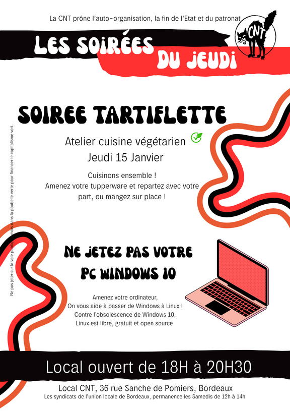 Soirée du Jeudi à la CNT, ce jeudi 15 Janvier à partir de 18h. Cuisinons ensemble une ou deux tartiflettes végétariennes en fonction du nombre de participant.e.s ! Soirée conviviale avec toujours l'atelier Linux ; amenez votre ordinateur et on vous aide à passer de Windows à Linux !