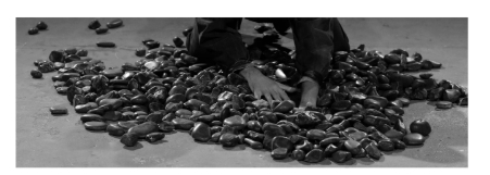 En entrant, le public découvre ce qui semble être un mémorial. Au sol, il y a un amoncellement de pierres noires éclairé par quatre projecteurs. L'atmosphère est au recueillement. Deux étranges personnages sont là, à l'écart. Attirés par le tas de cailloux, ils se lèvent, s'en approchent, tournent autour... Sous le mémorial, ils découvriront les traces laissées par la traite. Venez entendre la parole des armateurs, des capitaines, des représentants de la chambre de commerce qui ont fait la richesse et la puissance de la ville en exploitant le corps des personnes esclavisées.