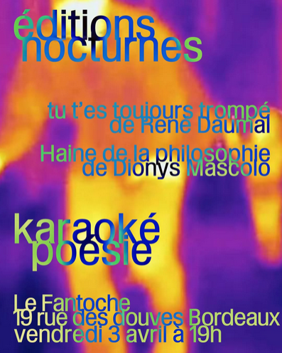 Vendredi 3 avril à 19h au Café Fantoche : Venez découvrir les deux premières publications des éditions nocturnes, leurs futures et en apprendre un peu plus sur le projet éditorial. La soirée se poursuivra avec un « Karaoké poésie », une performance participative mise en scène et écrite par Solène Arbel.