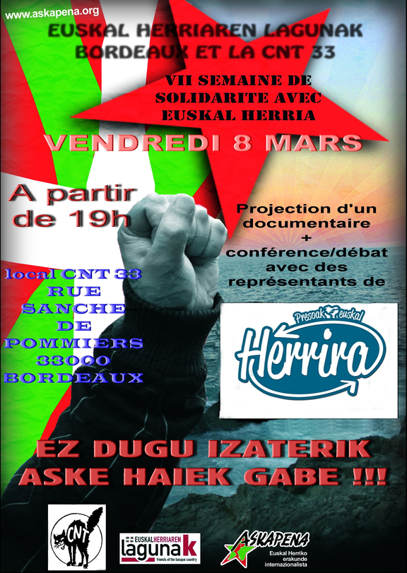 A l'occasion de la VII semaine de solidarité avec le peuple basque, les différents comités de soutien créés ces dernières années organiseront diverses manifestations, et ce, sur plusieurs états, et même plusieurs continents.