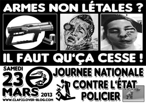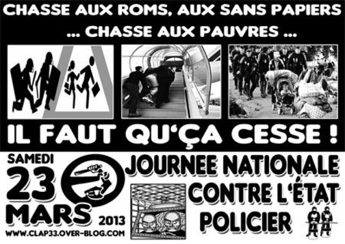 Pour la troisième année consécutive, le collectif Contre Les Abus Policiers de Bordeaux (C.L.A.P33) s'associe à toutes les énergies qui s'agrègent et inventent - en France et dans le monde (Québec, Belgique ...) des actions de résistances, de dénonciations, d'informations, de solidarités... contre l'Etat Policier en ce mois de Mars 2013.