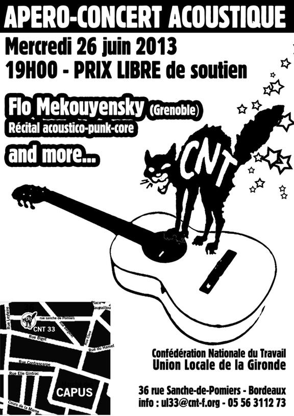 "Flo joue de la guitare et chante. Des chansons fort belles et simples avec des paroles rebelles, drôles, émouvantes et un tantinet énervées aussi, hein...Y'a absolument aucun myspace, bout de concert sur youtube... rien... faut nous faire confiance..."