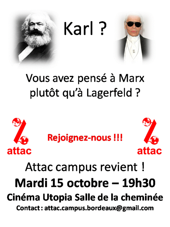 Pour cette nouvelle année universitaire, ATTAC campus Bordeaux vous invite à une soirée de rentrée pour présenter ses actions, ses projets, et vous inviter à participer à l'activité du groupe...