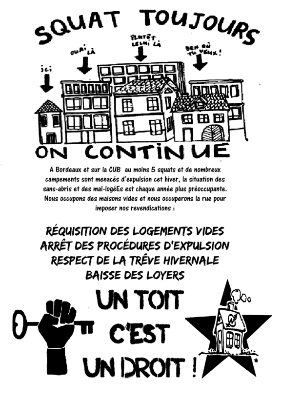 A Bordeaux et sur la CUB 5 squats et de nombreux campements sont menacés d'expulsion cet hiver, la situation des sans-abris et des mal-logéEs est chaque année plus préoccupante.