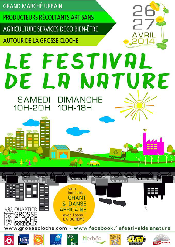 Organisée avec le soutien de la Mairie de Bordeaux, la 6ème édition du Festival de la Nature suit la semaine nationale du Développement Durable (du 1er au 7 avril 2014) et se tient donc le samedi 26 avril et le dimanche 27 avril 2014 dans tout le quartier Saint James, Grosse Cloche, Saint Eloi de Bordeaux .