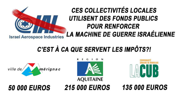 En favorisant l' importation et l'exportation des armes d'Israël et en facilitant le développement de la technologie militaire israélienne, les collectivités locales qui financent cet événement (Mairie Mérignac : 50 000 euros, Conseil Régional Aquitaine : 215 000 euros, CUB : 135 000 euros) et qui acceptent la présence d' ISRAEL AEROSPACE INDUSTRIE (IAI) envoient de fait un message clair d'approbation de l'agression militaire israélienne, y compris de ses crimes de guerre.