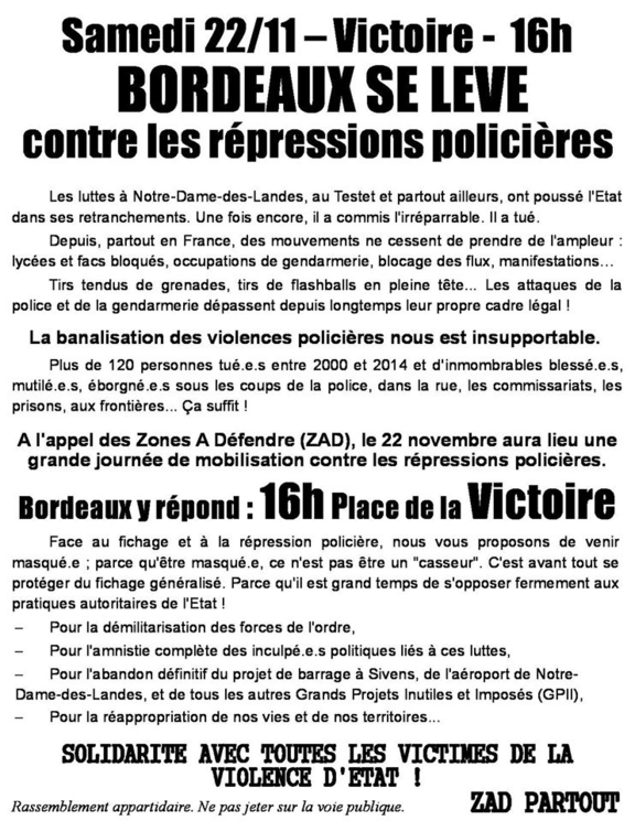 A l'appel des Zones A Défendre (ZAD), le 22 novembre aura lieu une grande journée de mobilisation contre les répressions policières.