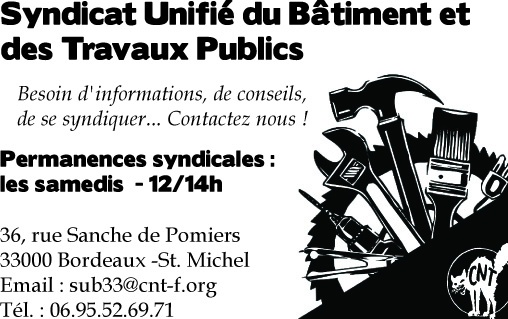 Le syndicat du Bâtiment et des Travaux Publics vous acceuille tous les samedi de midi à 14h au local de la CNT.