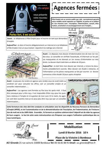 Devant les fermetures de Pôle-Emploi les après-midi, la mise en place à marche forcée de la dématérialisation et la mise en place du corps des contrôleurs de la recherche d'emploi, AC ! Gironde est solidaire de l'appel à la grève nationale de l'intersyndicale de Pôle emploi pour le 8 février 2016.