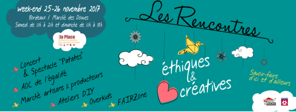 Le temps d'un week-end d'animations mêlant jeux et réflexions, l'association La Place - Plateforme Aquitaine de commerce équitable s'associe à la Halle des Douves pour vous proposer Les "Rencontres éthiques et créatives - Savoir-faire d'ici et d'ailleurs". Ce rendez-vous, festif et éthique, est un temps fort de promotion citoyenne où chacun(e) est invité(e) à privilégier avec enthousiasme et détermination, dès que possible, des alternatives responsables et solidaires à nos modes de consommation. Cet événement donne la parole et un visage aux artisans, créateurs et associations, qu'ils soient locaux ou d'autres continents, pour mettre en avant des modes de production à forte valeur ajoutée humaine et environnementale…rien de tel pour célébrer le mois de l'Économie Sociale et Solidaire.