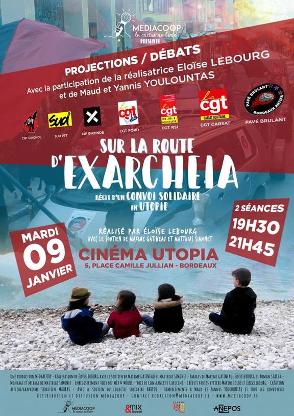 L'enthousiasme des convois solidaires vers la Grèce déboulera en Gironde avec les projections-débats du superbe film "Sur la route d'Exarcheia - Récit d'un convoi solidaire en utopie". La réalisatrice Éloïse Lebourg sera présente ainsi que Maud et Yannis Youlountas, du collectif Anepos qui organise ces convois. Quelques convoyeurs locaux seront aussi présents.
