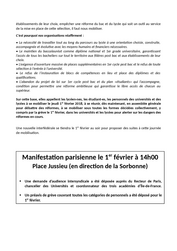 Sur cette base, elles appellent les lycéen·nes, les étudiant·es, les personnels des universités et des lycées à se mobiliser le jeudi 1 er février 2018, à se réunir, dès maintenant, en assemblée générale pour débattre des réformes, à se mobiliser sous toutes les formes décidées collectivement, y compris par la grève le 1 er février, dans les universités et les lycées pour alerter sur les dangers des réformes en cours.